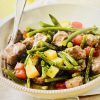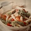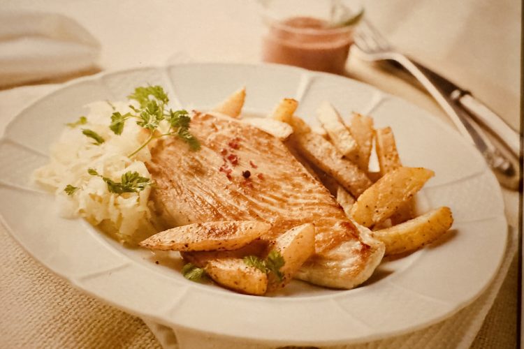 - Putenschnitzel mit den Kohlrabipommes, Tomatendip und Krautsalat auf Tellern anrichten, mit rosa Pfefferbeeren und Petersilie garnieren und servieren.